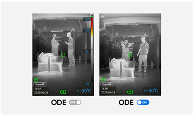 در تصاویر حرارتی با رنگهای کاذب ، نمایش بر اساس نقشهبرداری دمایی انجام میشود که باعث میشود جزئیات دیداری در نقاط بسیار داغ، تخت و محو به نظر برسند. تکنولوژی ODE بدون دستکاری در دادههای دمایی، وضوح و جزئیات را تقویت میکند. در مدل HIKMICRO FP21، با فعالسازی این عملکرد، خطوط محیطی هدف بسیار شفافتر میشود؛ هرچند که در مقابل، نویز تصویر نیز به همان نسبت افزایش مییابد.