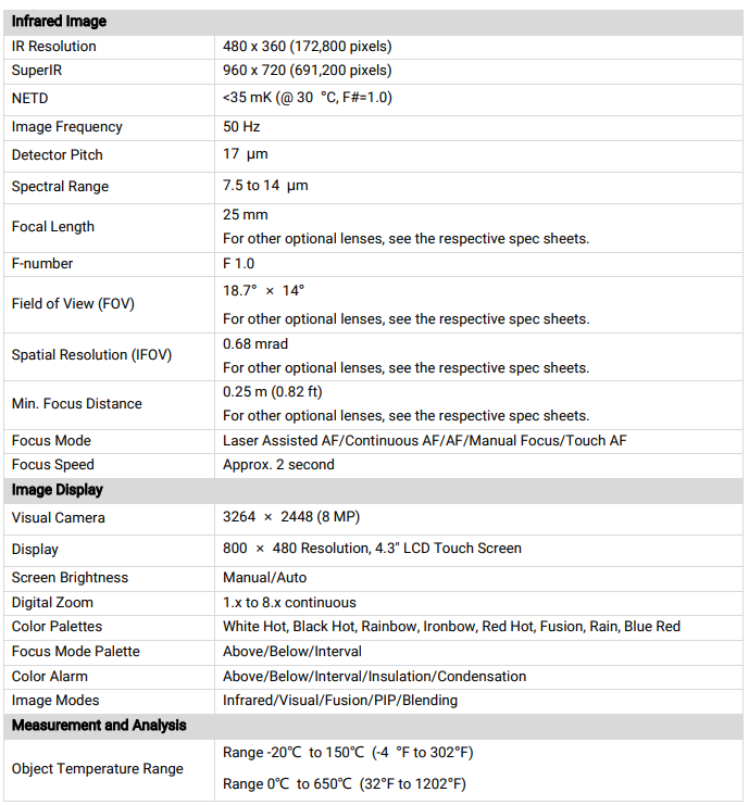 پشتیبانی از ۵ حالت فوکوس (فوکوس خودکار با کمک لیزر، فوکوس خودکار مداوم، فوکوس خودکار معمولی، فوکوس دستی و فوکوس لمسی) همراه با سرعت بالای فوکوس تنها در ۲ ثانیه، به شما کمک می‌کند تا با ثبت تصاویری شفاف‌تر، در زمان خود صرفه‌جویی کرده و به اندازه‌گیری‌های دقیق‌تری از دما دست یابید.