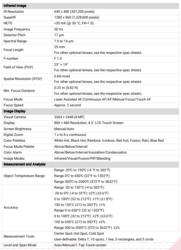 پشتیبانی از ۵ حالت فوکوس (فوکوس خودکار با کمک لیزر، فوکوس خودکار مداوم، فوکوس خودکار معمولی، فوکوس دستی و فوکوس لمسی) همراه با سرعت بالای فوکوس تنها در ۲ ثانیه، به شما کمک می‌کند تا با ثبت تصاویری شفاف‌تر، در زمان خود صرفه‌جویی کرده و به اندازه‌گیری‌های دقیق‌تری از دما دست یابید.