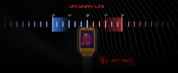 از ثبت تصاویر رادیومتری در تمام صفحه پشتیبانی میکند و بهطور خودکار نقاط حداکثر/حداقل/مرکز را ردیابی میکند تا ناهنجاریهای دمایی را در یک نگاه مشخص کند. دما را از ۲۰- درجه سلسیوس تا ۵۵۰ درجه سلسیوس با دقت تا 2+/- درجه سلسیوس یا 2%+/- از مقدار خوانده شده، بهطور دقیق اندازهگیری میکند.